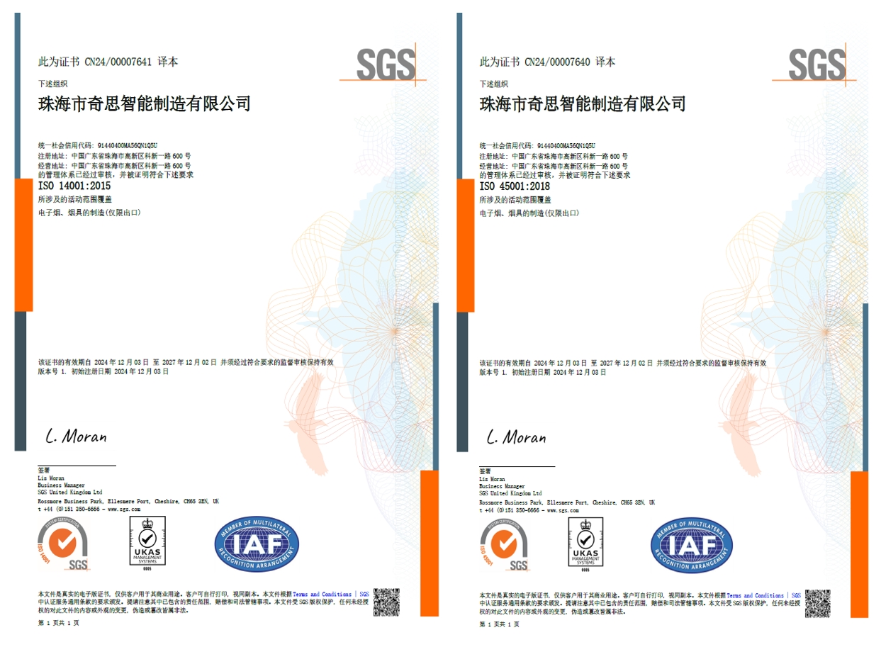 By adminRecently, Geekvape’s wholly-owned subsidiary Zhuhai Qisitech Co., Ltd. (hereinafter referred to as “Zhuhai Qisi”) successfully attained the international ISO14001 Environmental Management System and ISO45001 Occupational Health and Safety Management System certifications. This achievement highlights Zhuhai Qisi’s commitment to enhancing environmental protection and ensuring employee safety and health through green manufacturing and a people-oriented approach, marking a new milestone in its journey towards sustainability.