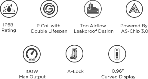 IP68 Rating P Coil with Double Lifespan Top Airflow Leakproof Design Powered By AS-Chip 3.0 100W Max Output A-lock 0.96" Curved Display |