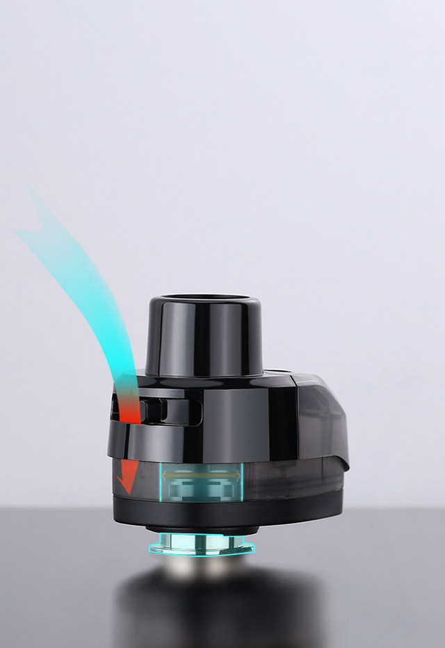 • The airflow enters via the side inlets, making it easier to reach the coil, resulting in superior flavor and more precise airflow control.