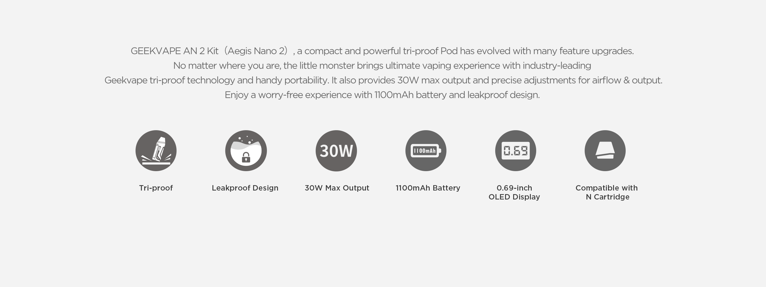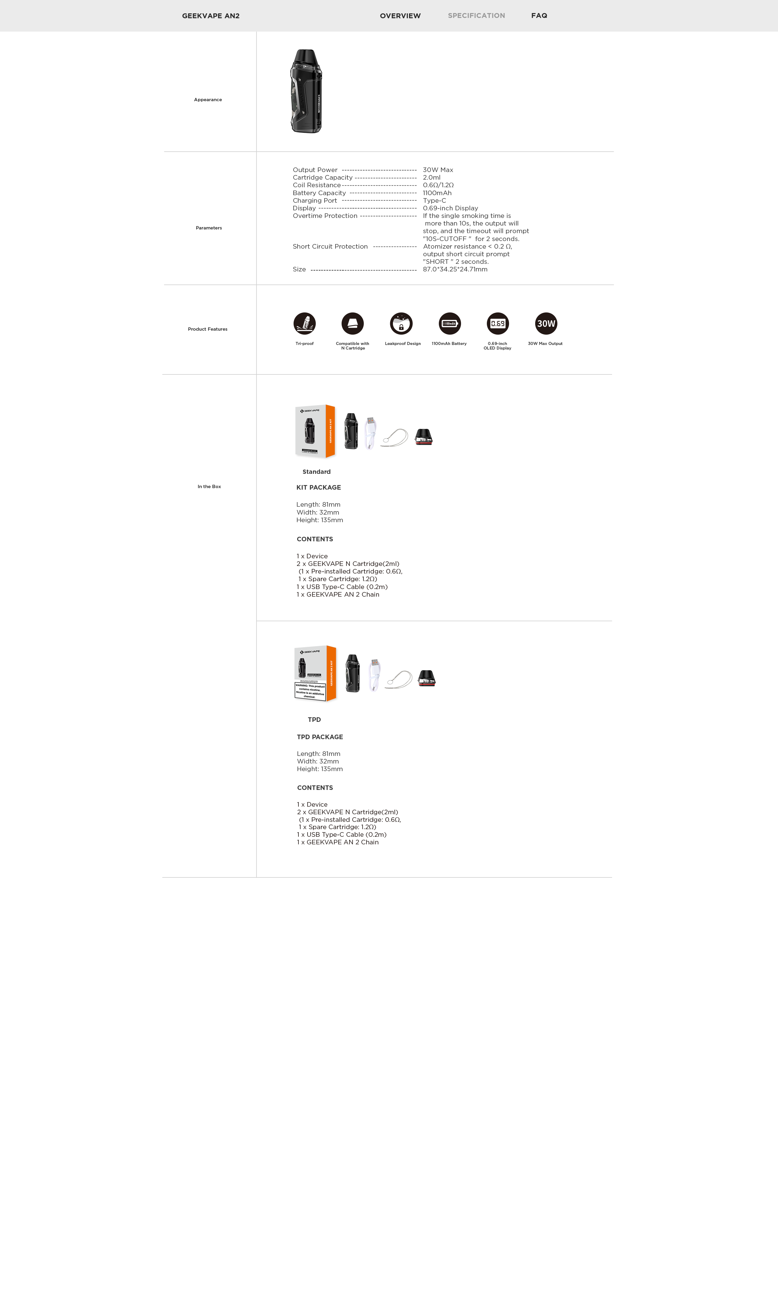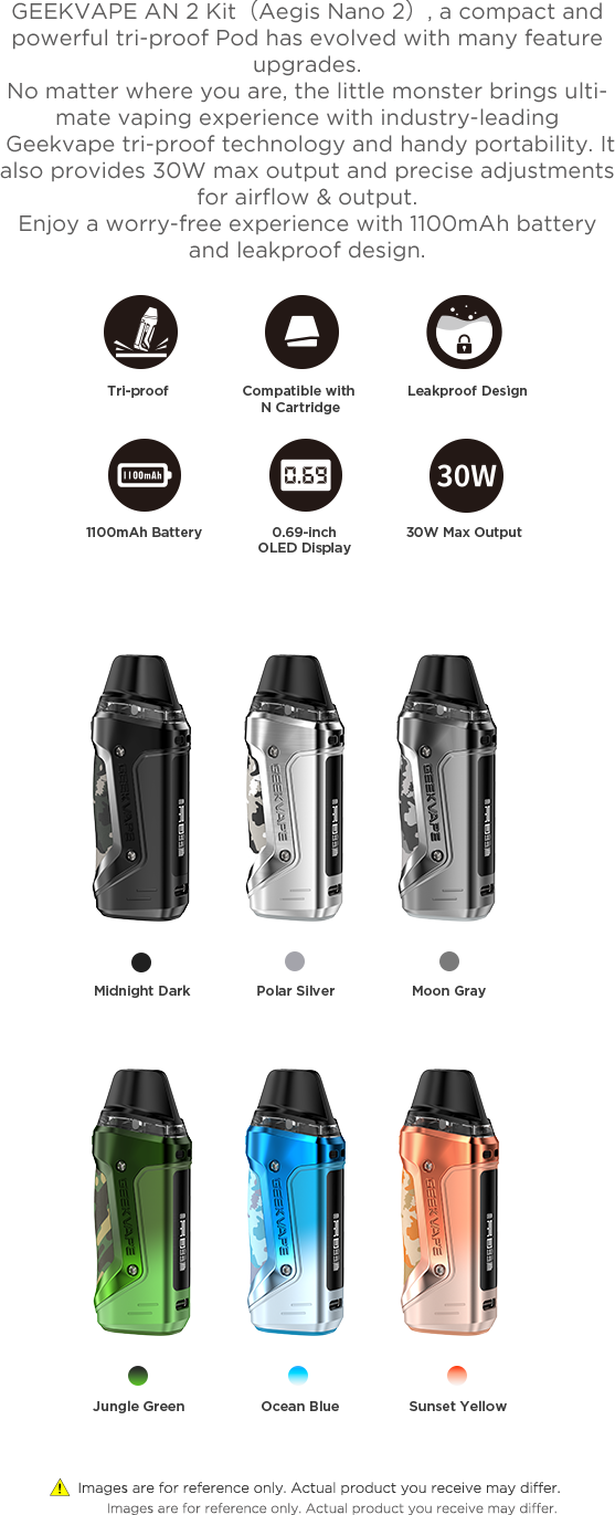 The industry-leading Geekvape tri-proof technology makes GEEKVAPE AN 2 more compact. Water & dust resistance, as well as a higher level of shock resistance, together provides better protection in harsher environments.