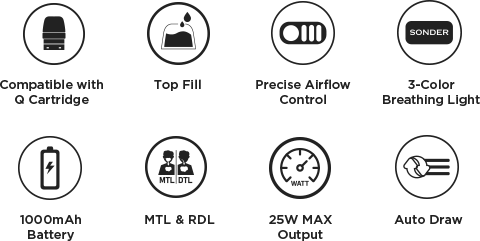 Compatible with Q Cartridge Top Fill Precise Airflow Control 3-Color Breathing Light 1000mAh Battery MTL & RDL 25W MAX Output Auto Draw |