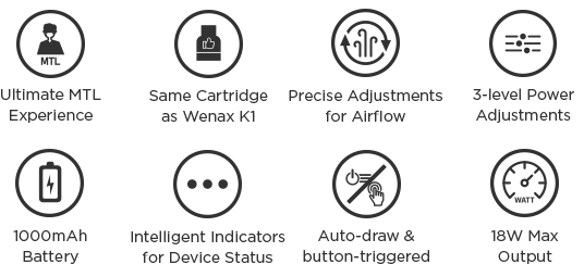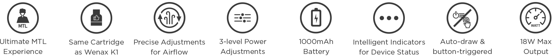 Indulge in the ultimate MTL experience with this sleek and well-polished metallic pod system. With precise control over airflow and output, it provides a customizable flavor to your favor. Its impressive battery life and intelligent LED indicators provide a worry-free experience, while the upgraded K1 Cartridge ensures a longer lifespan. Wenax K2, the vape that lets you love to chill!