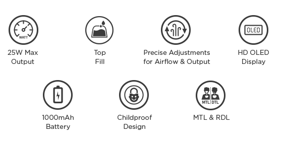 25W Max Output Top Fill Precise Adjustments for Airflow & Output HD OLED Display 1000mAh Battery Childproof Design MTL & RDL |